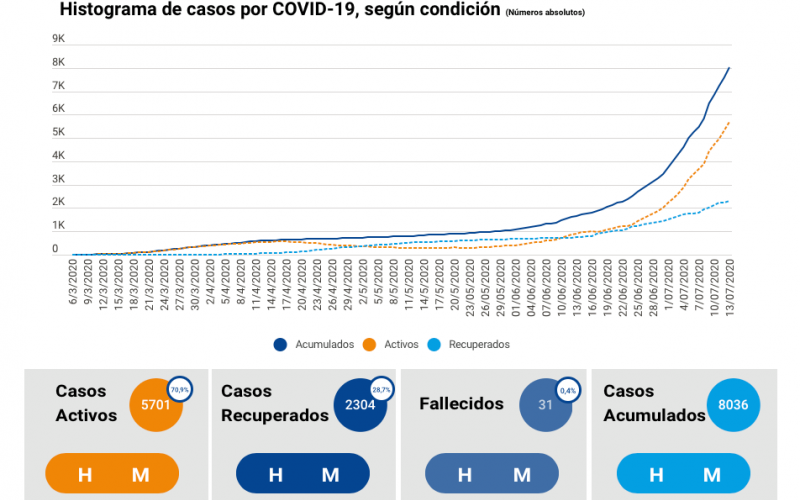 Lunes 13 de julio, 2020. Al 13 de julio el país registra 440 casos nuevos de COVID-19, para un total de 8036 casos confirmados, con un rango de edad de cero a 96 años. Se trata de 3458 mujeres y 4578 hombres, de los cuales 5666 son costarricenses y 2370 son extranjeros.